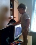 Сегодня Славуньку застали на месте преступления. Пока готовила ему кашу и мужу завтрак,наш малыш решил нахулиганить.Взял машинку и ушел.Звала,звала,а в ответ тишина. Пошла искать. Захожу в спальню.Влад спит,а Слава на компьютерном столе стоит и думает что сделать. Увидел меня и говорит:"тись".Когда папа или Влад спит,Слава к ротику прикладывает пальчик и говорит( тись- тише).