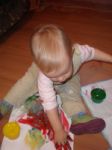 Обожаем работать с пластилином. Впервые я дала ей его в 1.6 и с тех пор Арина без лепки дня не может. Еще толком не могла говорить, а уже просила у меня, при этом делала движени руками как во время лепки и говорила пит (т.е. лепить). Сначало мы просто рвали маленькие кусочки, мяли его. Где-то в апреле я нарисовала на листке воздушные шарики и мы с Риной отламывали маленькие кусочки, делали из них маленькие шарики и вставляли из в овалы. После этого она начала сама катать маленькие шарики. Где-то месяц назад я взяла листко и показала ей, что пластилин можно размазывать, как-будто красишь лист. Позавчера Риша взяла этот листок, попросила у меня еще пластилин, я была занята, поэтому дала ей его и ушла. Когда же я пришла, то просто была в шоке. Что мой ребенок сделал самостоятельно, вы увидите на фотонрафии.