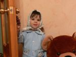 Когда Настю искупали после болезни, решила одеть на голову косыночку. Ну прям на Алёнушку похожа. Настя со мной не согласилась. Я Настя говорит.