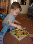 В начале марта купила Мишке деревянные пазлы,картинка "Простоквашино",на ней изображены все герои мультфильма. И вот благодаря этой игре Миша научился говорить папа.