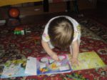 Баба Алла подарила на день Рождения книжку, в ней буквы и рядом обозначение и трафарет чтобы обвести можно было и кто муже там были фломастеры. Анюте очень нравиться обводить буквы, цифры, фигурки.