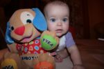 Миленочке очень интересно слушать поющие игрушки, мамины колыбельные, колыбельные музыкальные, очень любит игрушки которе светятся и поют.