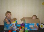 У нас в Ростове на Дону пошла череда дождей! На улице не погуляешь, приходится дома играть-веселиться! И вот Настенька придумала играть в домики. Посадила Машу в коробку и сама в другую залезла. Вот так сидели девчата и играли, пока Маше не надоело там жить, стала плакать на свободу проситься! Ползать очень захотелось по полу, а не сидеть на месте!