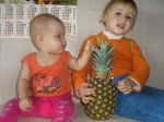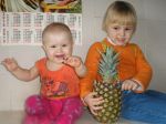 Вчера купили в магазине ананас. Захотелось Насте попробовать, что это за фрукт! Принесли домой и давай с ним играться, уж такой он красивый. Даже Маше понравился. Она его по полу катала, за листики трогала. Вот так игрушка!