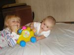 Сегодня так Настя играла с Машей, катали вместе кролика-каталку. Настя тянула его в свою сторону, а Маша в свою. Я думала они подерутся. А нет. Им такое занятие пришлось по душе, обе смеялись и игрались. Кролик остался жив!