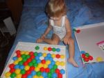 Купили Лизе мозаику с крупными детальками. Она долго с ними играла перед дневным сном, пока не наигралась, спать не легла. Хочется научить по цветам раскладывать.