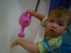 Желание подражать повлияло на то, что совсем недавно Лиза открыла для себя лейку. После того, как полили цветы, дочка минут 15 просила, чтобы наливали воду в лейку и пыталась вылить воду из неё в ванну. Ей это занятие, ну, очень понравилось!