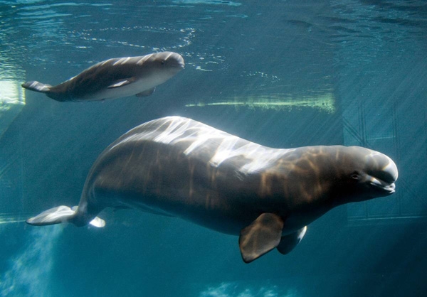Чикагский Аквариум Шедд демонстрирует новорожденного самца белого кита, плавающего с его матерью Пуиджи.