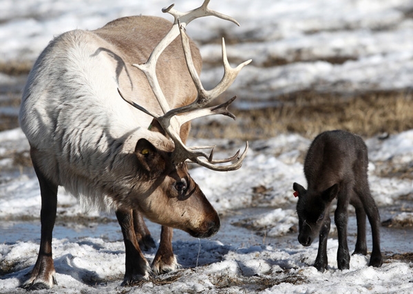 Олениха и ее новорожденный олененок возле Alaska Agricultural and Forestry Experiment Station.