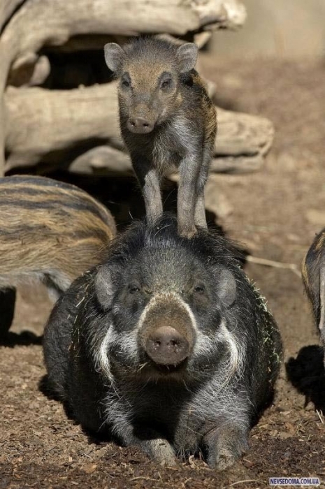 Шестинедельный бородавочник играет в царя горы на своей маме в зоопарке Сан-Диего. Этот вид свиней находится в опасности, они водятся лишь на двух островах Филиппин.