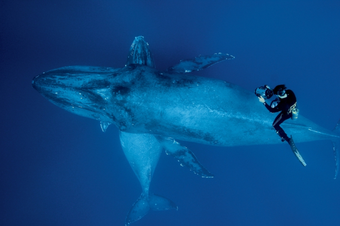 Высокие технологии на службе науки: исследователь Джейсон Стерджис из Китового фонда (Мауи) фотографирует самку с годовалым детенышем специальной камерой с высоким разрешением. Автор: Флип Никлин