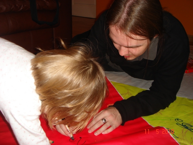 Пришел Сашенька с работы, а Вика его уже встречает. Разложила плакатные листы на полу и протягивает братику карандаш :" Рисуй". Вот так и творили вместе два моих художника ! Рисовали, конечно, по актуальной на сегодня теме : НУ, ЗАЯСЬ, ПАПАДИ !"