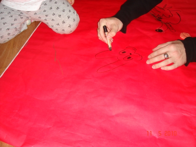 Пришел Сашенька с работы, а Вика его уже встречает. Разложила плакатные листы на полу и протягивает братику карандаш :" Рисуй". Вот так и творили вместе два моих художника ! Рисовали, конечно, по актуальной на сегодня теме : НУ, ЗАЯСЬ, ПАПАДИ !"
