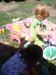 Вот где раздолье для игр и развлечений!!! Что только мы ни сделали за какие-то 3 часа: катались на качелях, на велосипеде, играли с игрушками, которые принесли соседи (у кого что было), брызгались водой, купались в вёдрах, ели конфетки, кормили кошечка... Это только небольшой списочек, за которым скрывается море удовольствия, масса приятных минут!