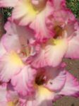 Наконец-то расцвёл гладиолус-гигант. Красавчик, ничего не скажешь, метр в длину, розовый с лиловой каёмочкой да с солнечной серединкой.